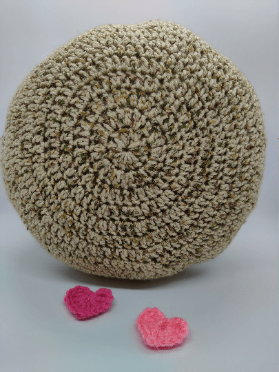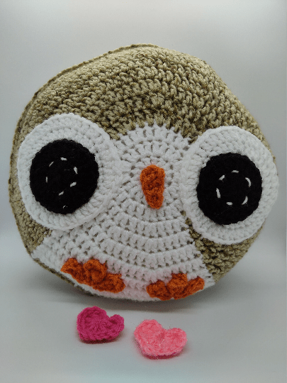 The standard round owl is roughly 10″ across and 4 to 5″ wide (depth). The primary color (in this case a neutral beige with flecks) is featured on the back and on most of the front. A lighter neutral color is featured in a triangular shape from the beak to below the feet, expanding to the bottom.