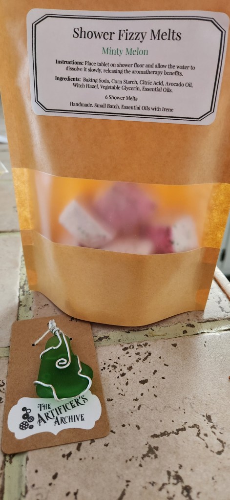 Finally, as you probably realize, I get to go to my mostly stressful day job and then come home to a warm and peaceful home which is filled with YARN that needs to be crafted into something whimsical. I’m so very thankful for my crochet skills which I originally learned as a young girl. My grandmother taught me to crochet, and over the decades I have been able to hone the skills to make fun, whimsical things, and – in turn – I get to set up a tent and sell them at craft festivals. Even though actual “selling” and “buying” are the points of these festivals, most of my joy comes from having people stop by and enjoying what I’ve made. Yeah, I get it, not everyone buys “stuff.” I’m the same way. I love walking through festivals and seeing all the things talented crafters make, but I am really not much of a spender. At Newport News Fall-O-Ween, I picked up a green glass pendant from the Artificer’s Archive and a bag of shower fizzy melts from Irene’s Essential Oils.