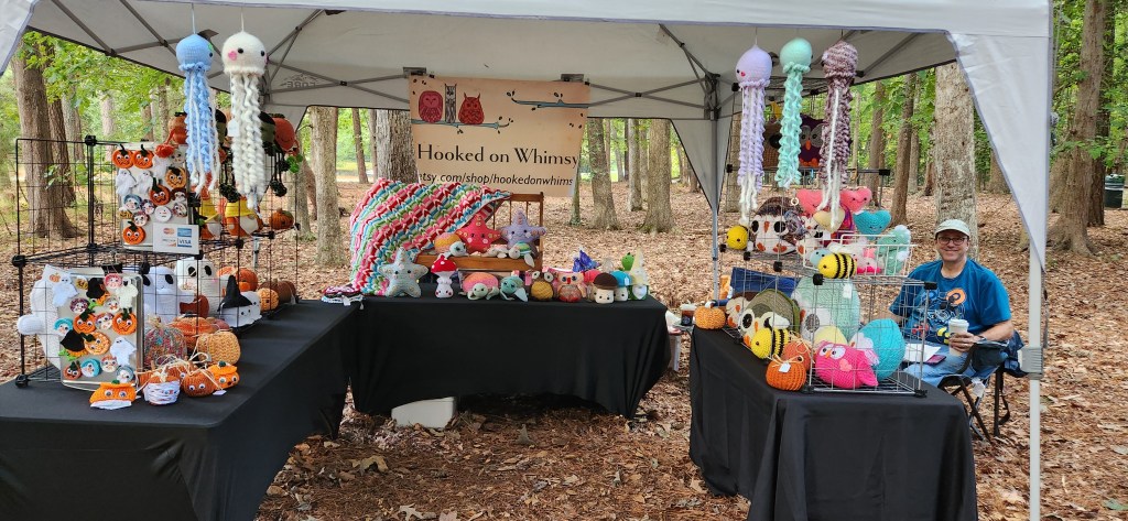 After several weeks of frantic crochet and knitting, the 28th of October arrived. The weather didn’t receive the memo that it was to be a FALL Festival, however. It was a brutal 90 degrees. I got a tan and suffered from heat exhaustion. The foot traffic that had been non-stop in 2022 was significantly less. I can honestly say the festival was a bust for me.