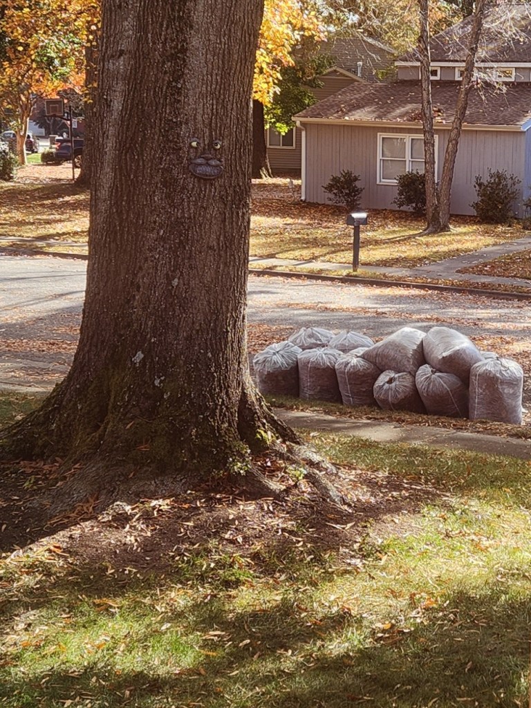 On the following weekend, fall decided to drop most of the leaves on our many, many, many trees. We love having the river birch, pin oak, crepe myrtle and pine trees. They offer shade and coolness in the summer. But we don’t love raking up the leaves. I even wrote a poem about them: