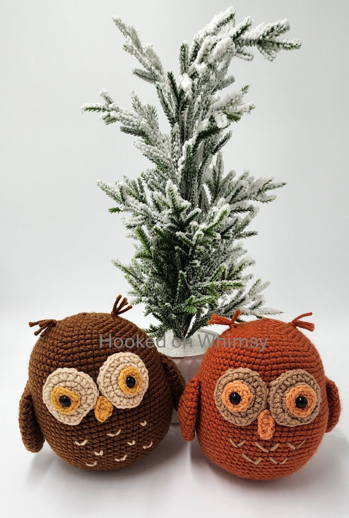 My most recent owls are 6-inch tall shelf sitting owls, or little toys (not for toddlers!) with those head feathers found on Screech Owls or Great Horned Owls. These were made via a pattern in Lauren Espy’s excellent collection of crochet patterns in her book Animal Amigurumi. I have my own pattern for shelf sitting owls, but Espy’s book helps me to simply follow along and removes all the guesswork for busy career people who need the crochet pattern experts to give us a hand!